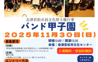 会津地方の学生バンドの祭典「バンド甲子園」が今年も開催されます。 「バンドを通じて、学区や世代を超えた交流を深めて欲しい」そんな思いで立ち上がった本イベントは、昨年より会津若松市民文化祭の一つとして開催されています。優勝・準優勝チームには記念品が贈呈されるほか、Schecter Japanからはベストプレイヤー賞として豪華景品をはじめ、新見楽器からは参加者全員に記念品も贈られます!! バンド仲間と思い出作りとして参加するもよし、ガチで優勝を狙いにくるもよし。 大人のゲストバンドも参加予定です。 エントリーはSUNSET音楽室窓口、またはこちらのエントリーフォームから♪ 今年も沢山の学生バンドのエントリー、お待ちしています♪ https://forms.gle/SDeoa7NLiVVhmfRw8